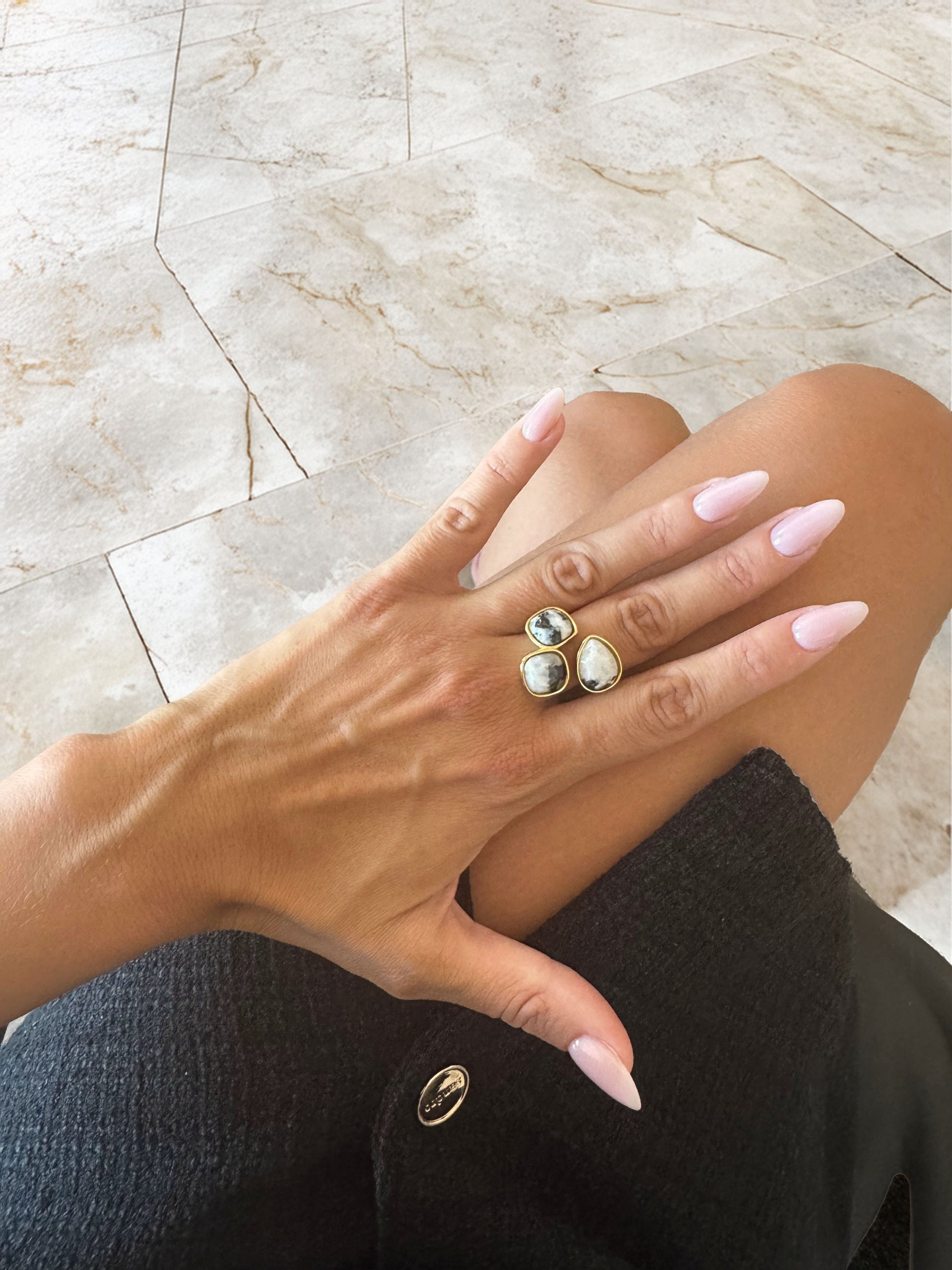 Bague en acier inoxydable composée de la pierre naturelle AGATE BLANCHE : 2 carrés et 1 goutte.