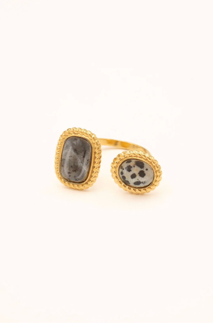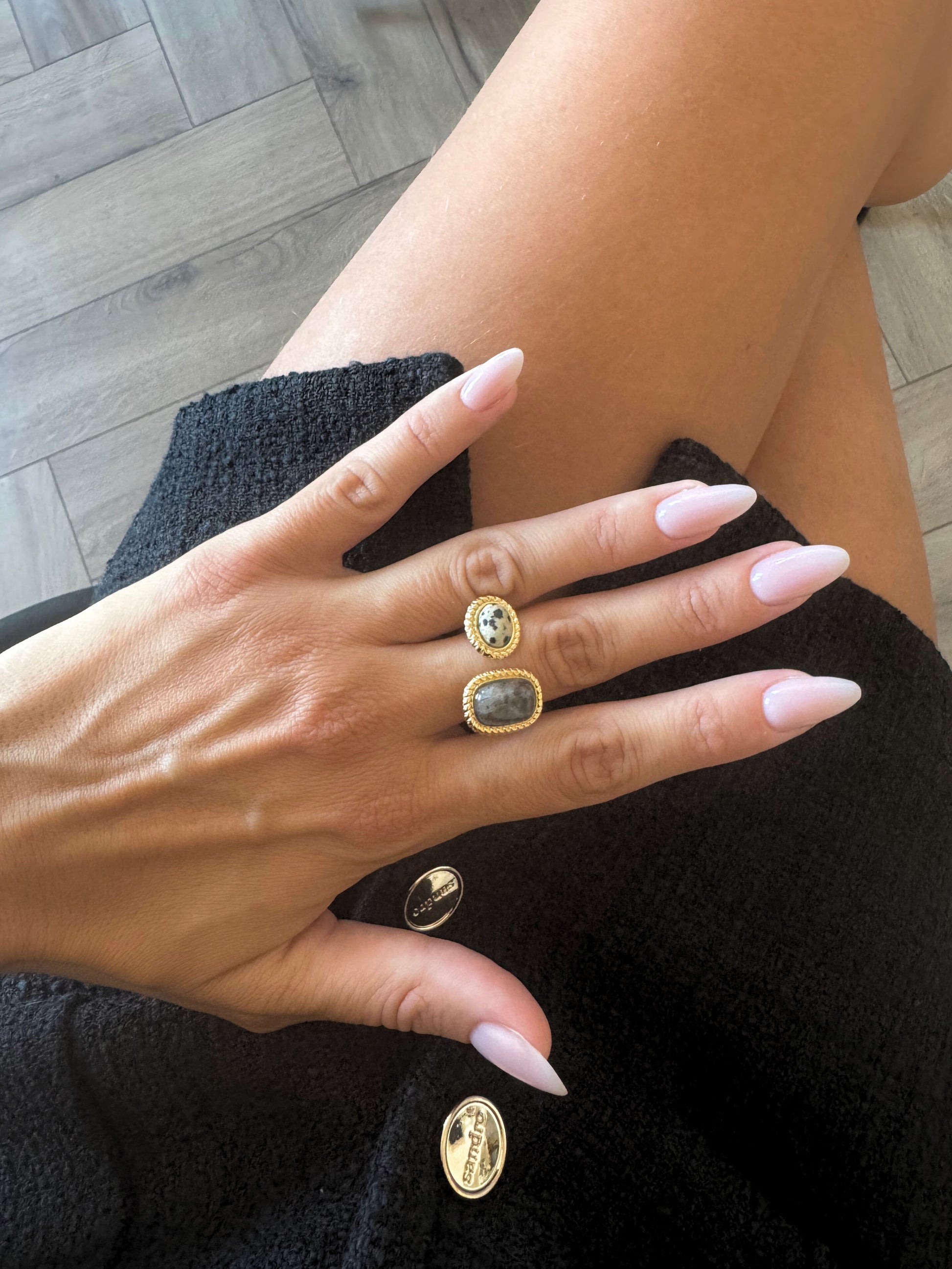 Bague en acier inoxydable composée d'une ouverture à l'avant et de deux pierres naturelles JASPE DALMATIEN sur un empiècement aux contours texturés.