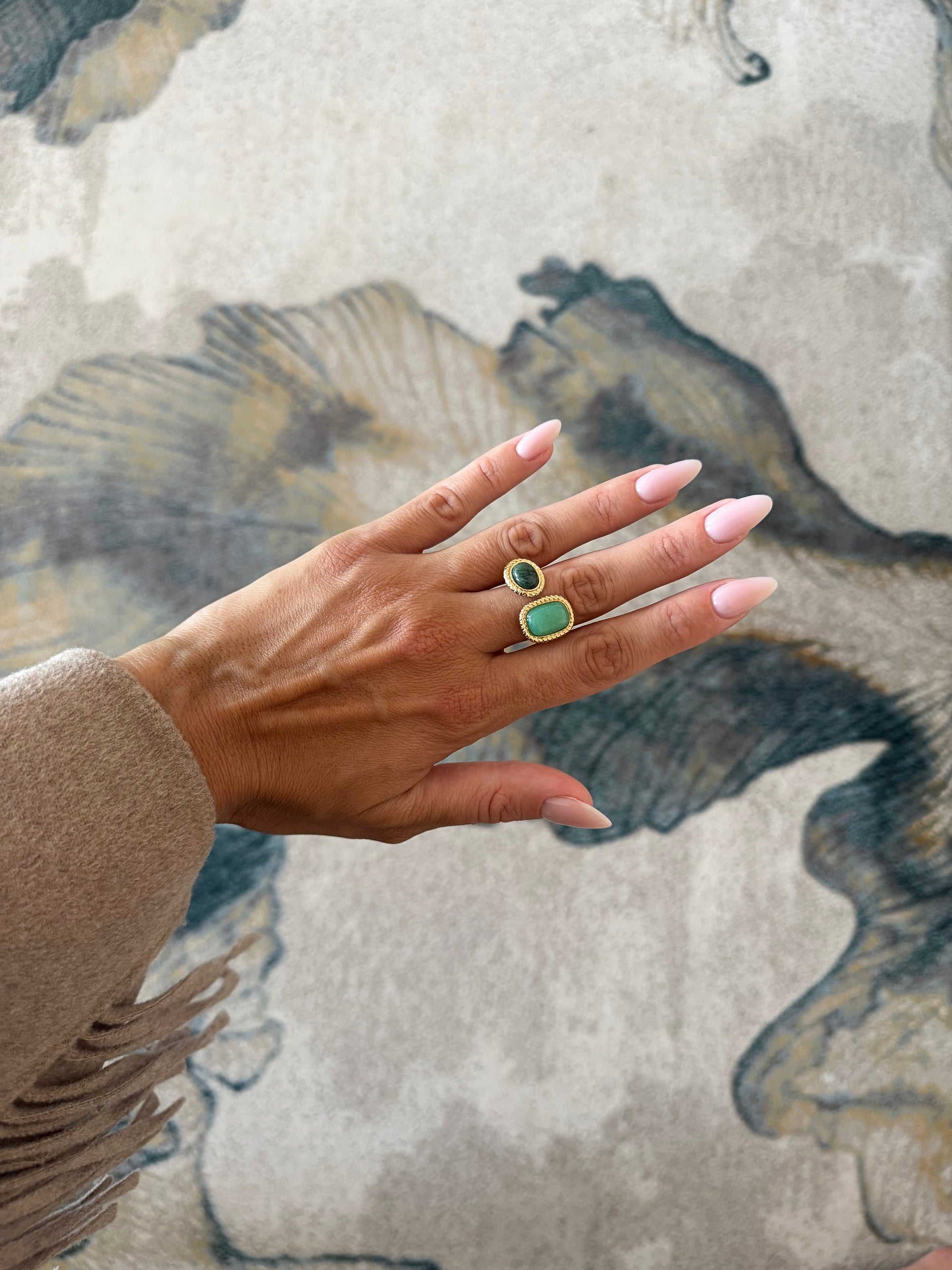 Bague en acier inoxydable composée d'une ouverture à l'avant et de deux pierres naturelles JASPE VERT sur un empiècement aux contours texturés.