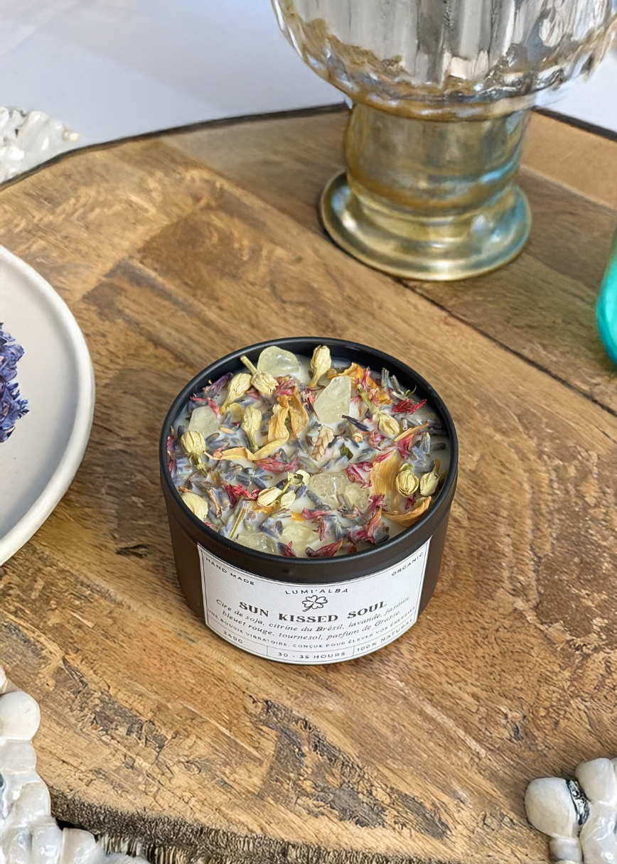 Née de la vibration solaire de la citrine du Brésil, de la douceur apaisante de la lavande et de l’éclat intuitif du jasmin, cette bougie est une célébration de la joie intérieure, de la clarté mentale et du rayonnement personnel.
